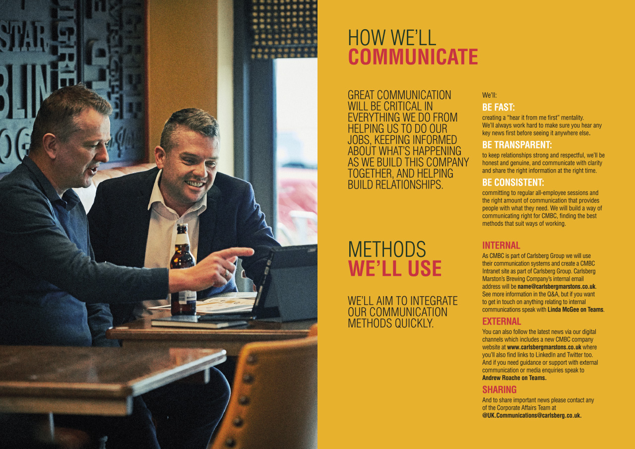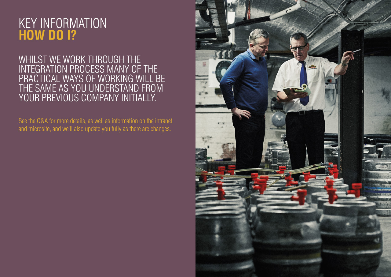 As part of the announcement we created several pieces of the main day one collateral including the animation to bring together the two companies logos and showcase the new JV logo to the world, a directory welcome book, limited edition beer mat and several internal comms pieces.